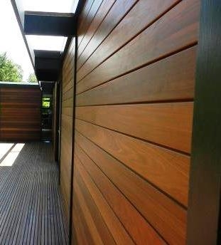 Garapa hardwood siding has golden to honey brown colors and is highly stable